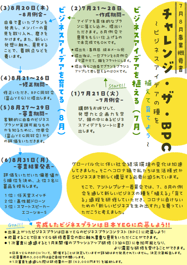 今年度も開催されることが決定した、日本YEG「第18回ビジネスプランコンテスト(BPC)」に大東YEGより1名でも多くの参加を目指して、引き継ぎ次回8月例会に向けて動いていきたいと感じさせて頂きました。